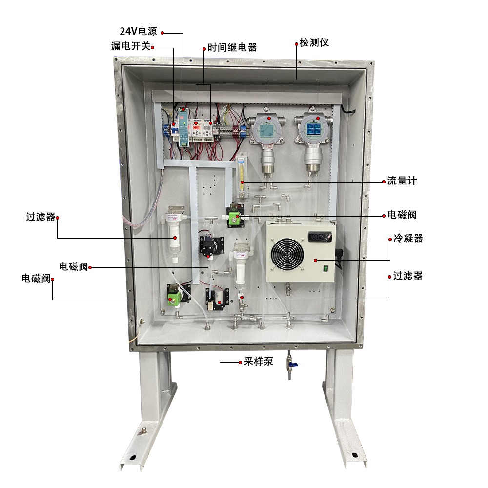 管道高溫氣體預處理系統主要組成部分為預處理整套系統加上氣體檢測儀,采用泵吸式采樣方式24小時連續監測,內置除水除塵過濾器,可以很好的保護傳感器不受高溫或濕氣環境侵害,儀表采用聲光報警裝置,帶高清顯示觸摸屏,可以存儲或者記錄歷史數據
